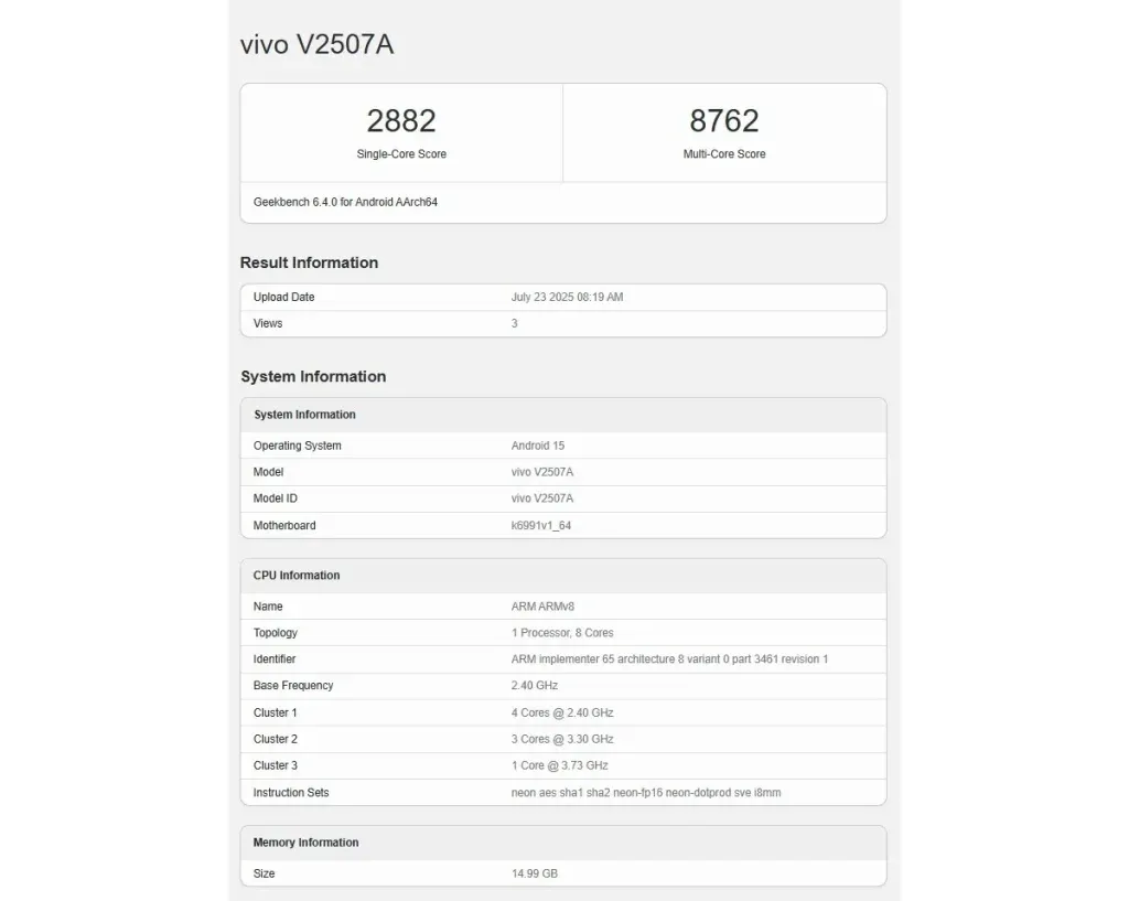 بحسب نتائج اختبار الأداء، ظهر هاتف جديد من فيفو برمز الطراز V2507A على منصة Geekbench. وقد سجل 2882 نقطة في اختبار النواة الواحدة و8762 نقطة في الاختبار متعدد الأنوية، وهو ما يعكس أداءً فائقًا.