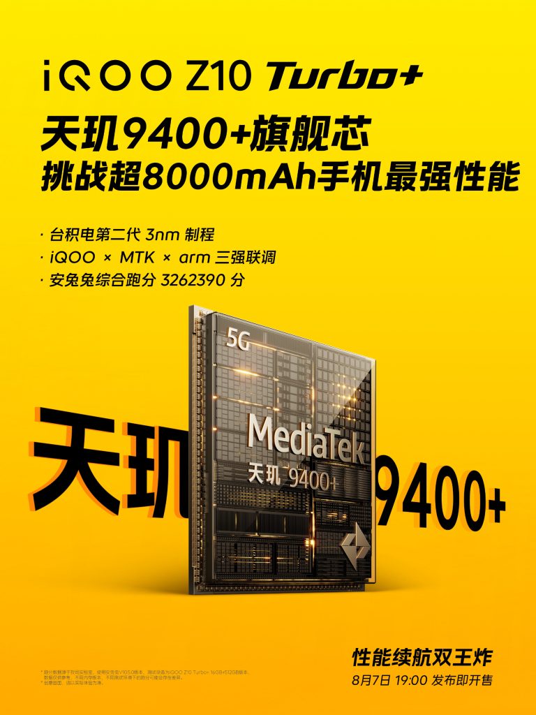 يعتمد هاتف iQOO Z10 Turbo+ على معالج MediaTek Dimensity 9400+، المُصنّع بتقنية 3 نانومتر من TSMC. يتميز المعالج بتصميم ثماني النواة يتضمن: