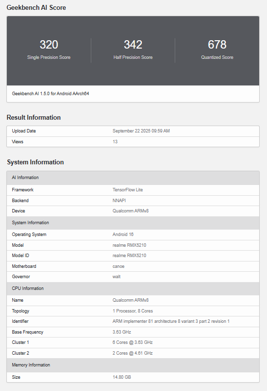 على منصة Geekbench AI. يشير وجود مواصفات مثل معالج Snapdragon 8 Elite Gen 5، وذاكرة وصول عشوائي (RAM) بسعة 16 جيجابايت، ونظام أندرويد 16 إلى أن هذا قد يكون هاتف Realme GT 8 Pro القادم.