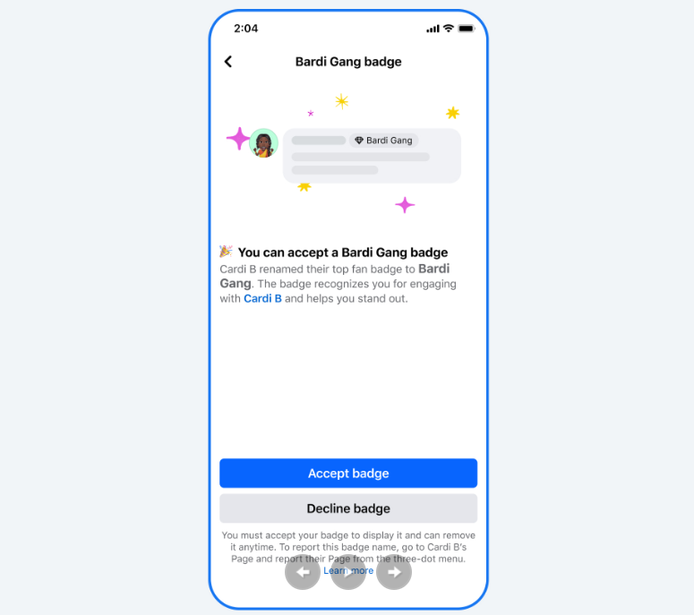 يعمل فيسبوك أيضًا على توسيع ميزة “شارات أكبر المعجبين” (Top Fan Badges) من خلال تقديم إصدارات مخصصة. تتيح هذه الشارات للمبدعين تصميم شارات فريدة لمعجبيهم الأكثر ولاءً، والتي يمكن عرضها بفخر على صفحات المبدعين والملفات الشخصية للمعجبين.