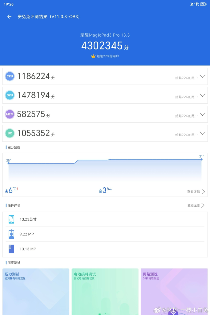 كما يظهر في الصورة أعلاه، حقق جهاز Honor MagicPad 3 Pro نتيجة مذهلة بلغت 4,302,345 نقطة على منصة AnTuTu. وجاءت النتائج التفصيلية كالتالي: