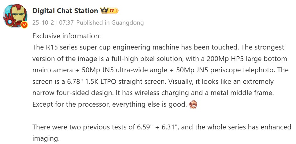 وفقاً للتسريب، سيصل هاتف Oppo Reno 15 Pro بشاشة 6.5x بوصة تدعم دقة 1.5K، مع حواف رفيعة للغاية ومتناظرة. وسيتميز أيضاً بكاميرا رئيسية بدقة 200 ميجابكسل من نوع Samsung HP5 مقترنة بوحدة عدسة GP مطورة لتحسين وضوح الصورة.