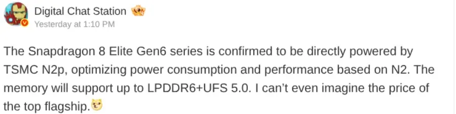 من المتوقع أن تكشف كوالكوم عن أول معالج لها مبني على تقنية 2 نانومتر، Snapdragon 8 Elite Gen 6، في أواخر عام 2026. ويتماشى هذا الإطار الزمني مع تسريب حديث من المصدر الموثوق Digital Chat Station.