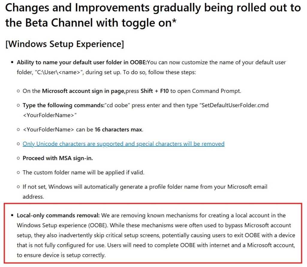 ، الذي كان يسمح للمستخدمين بتجاوز جزء من عملية الإعداد الأولية، مما كان يتيح في النهاية خيار إنشاء حساب محلي. والآن، شددت مايكروسوفت من قبضتها أكثر.
