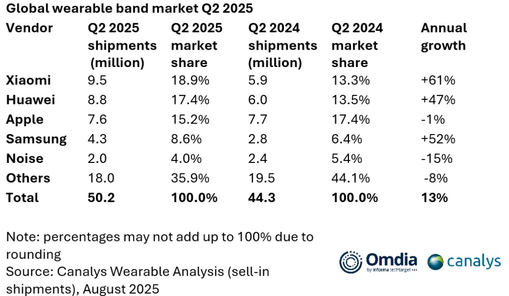 لكن التحول الحقيقي يحدث تحت السطح. فبينما تقود الأساور البسيطة حجم المبيعات، تتركز القيمة المالية حول الساعات الذكية. شكلت الساعات الذكية 32% فقط من شحنات الربع الثاني، لكنها ولّدت 69% من القيمة الإجمالية للسوق. وبعبارة أخرى، يشتري عدد أقل من الناس ساعات ذكية، لكنهم ينفقون عليها مبالغ أكبر.