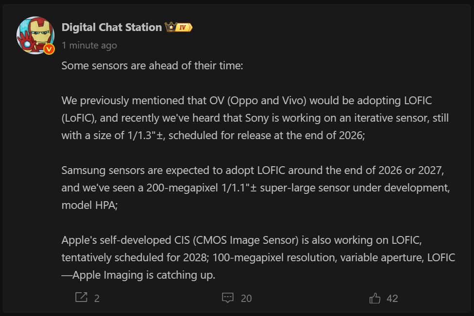 تدعي أحدث شائعة أن كاميرا أبل بدقة 100 ميجابكسل لن يُتوقع وصولها قبل عام 2028. ويقول مسرب على Weibo إن مستشعر LOFIC الداخلي للشركة بدقة 100 ميجابكسل سيصل في عام 2028.