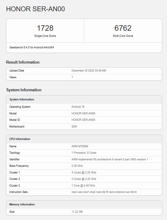 تم إدراج الجهاز الذي خضع للاختبار تحت المعرف الرمزي “Honor SER-AN00”. ووفقاً لبيانات المنصة، تم تجهيز الهاتف بذاكرة وصول عشوائي (RAM) بسعة 12 جيجابايت، مما يضعه في فئة الهواتف القوية المخصصة للأداء.