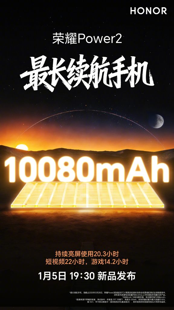 يؤكد الملصق الإعلاني أن Honor Power 2 سيحتوي على بطارية بسعة 10,080 ملي أمبير، مما يجعله صاحب أكبر بطارية في تاريخ هواتف هونر حتى الآن.