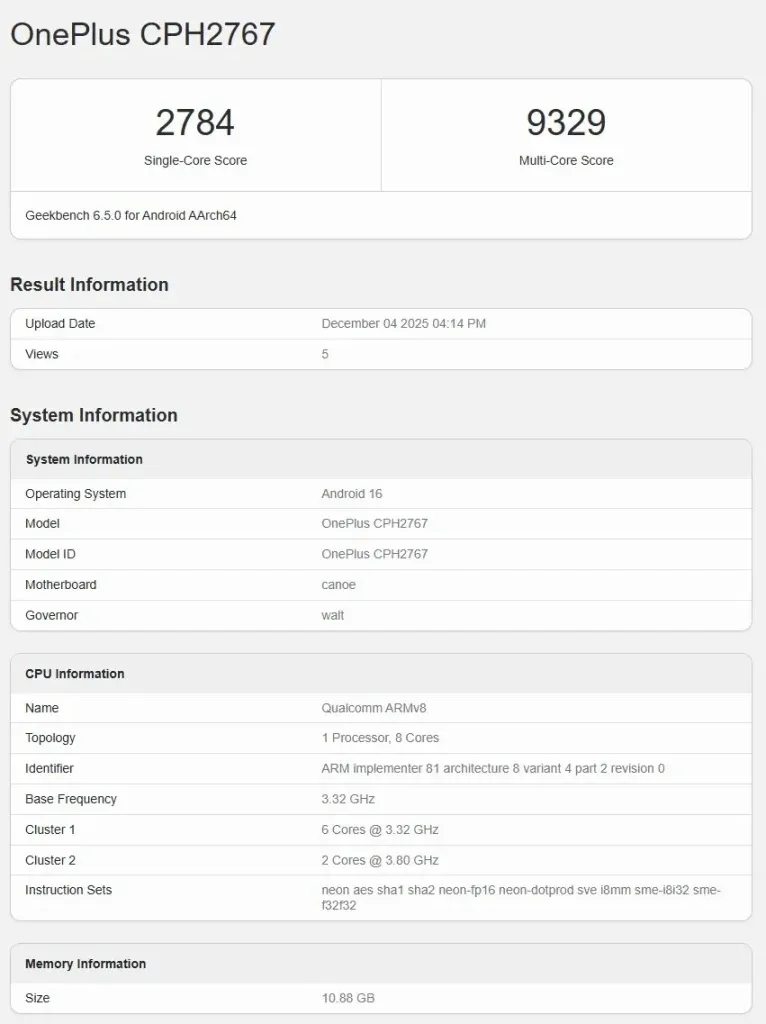 وعلى الرغم من أن اسم الشريحة لم يُذكر صراحةً في القائمة، إلا أن تفاصيل “وحدة المعالجة المركزية” (CPU) و”وحدة معالجة الرسوميات” (GPU) تؤكد بما لا يدع مجالاً للشك استخدام هذه الشريحة، مما يشير بقوة إلى أن هذا الجهاز هو OnePlus 15R القادم.