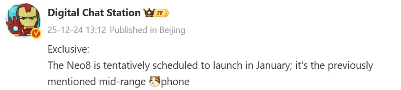 وفقاً للمعلومات المنشورة على منصة “ويبو” الصينية، من المتوقع أن يتم الإعلان عن Realme Neo 8 في الصين خلال شهر يناير 2026.
