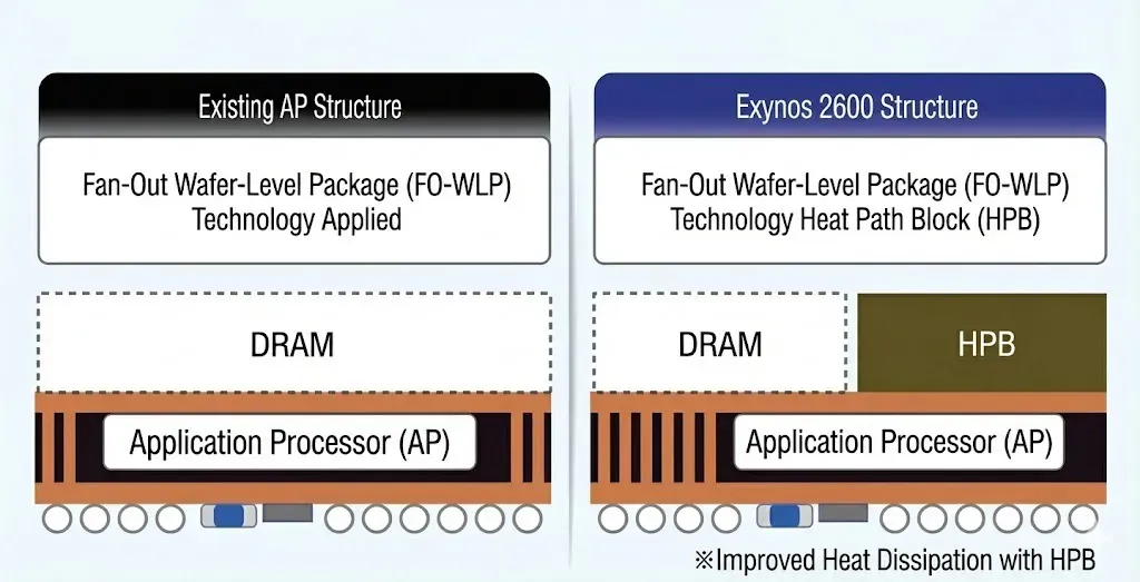 في الأجيال السابقة، كانت ذاكرة “دي رام” (DRAM) توضع مباشرة فوق الشريحة. ولكن هذه المرة، قامت سامسونج بدمج مشتت حراري (Heat Sink) قائم على النحاس بتقنية HPB ووضعه مباشرة فوق المعالج، مع نقل الذاكرة إلى الجانب.