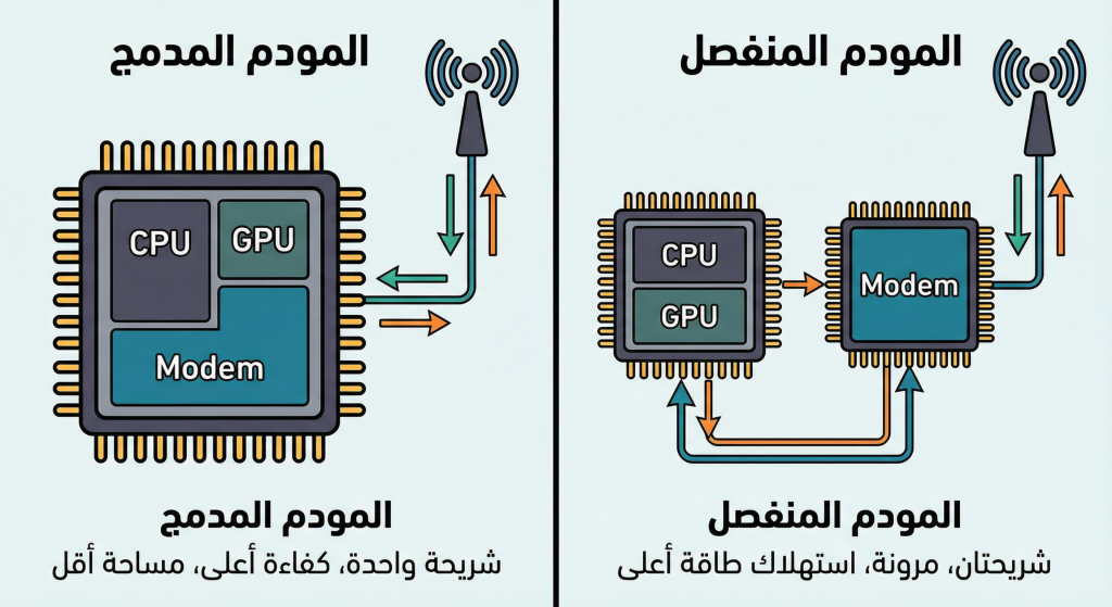 - المودم الخارجي قد يؤدي لاستهلاك أعلى للطاقة وحرارة أكبر مقارنة بالحلول المدمجة في شريحة واحدة.
