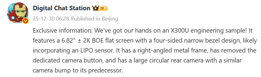 وفقاً للتسريبات، تتميز الوحدة الهندسية الخاصة بهاتف Vivo X300 Ultra بشاشة مسطحة (Flat Display) بحجم 6.82 بوصة مصنعة من قبل شركة BOE.