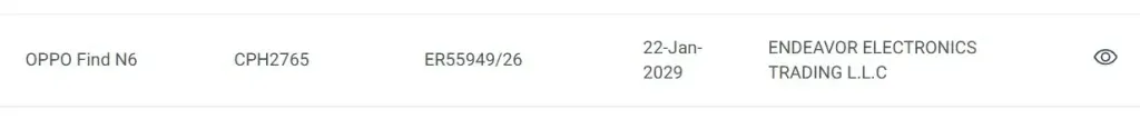رصدت قواعد البيانات التقنية حصول هاتف Oppo Find N6، الذي يحمل رقم الطراز CPH2765، على موافقة هيئة تنظيم الاتصالات والحكومة الرقمية في الإمارات (TDRA).