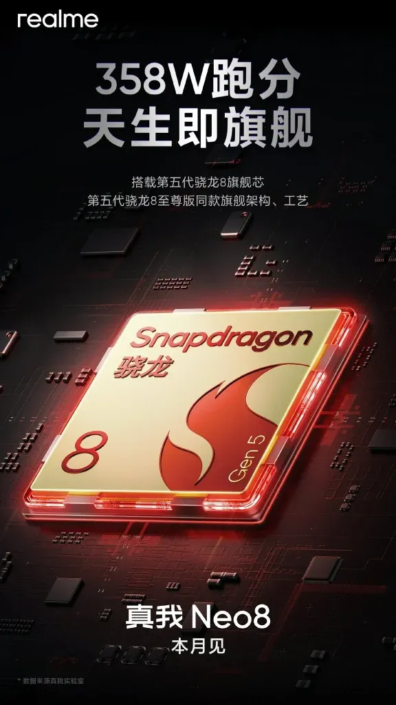 أعلنت ريلمي أن هاتف Neo 8 سيعمل بمنصة Qualcomm Snapdragon 8 Gen 5. وهي نفس الشريحة القوية التي ستشغل هواتف منافسة مثل iQOO Z11 Turbo القادم و OnePlus Ace 6T المتوفر بالفعل في الصين.