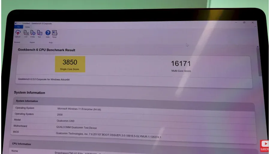 للمقارنة: يسجل جهاز MacBook Air المزود بشريحة M4 (بـ 10 أنوية) حوالي 3,839 نقطة للنواة الواحدة و 14,861 للأنوية المتعددة، مما يضع شريحة كوالكوم في منافسة مباشرة وتفوق طفيف في تعدد المهام.
