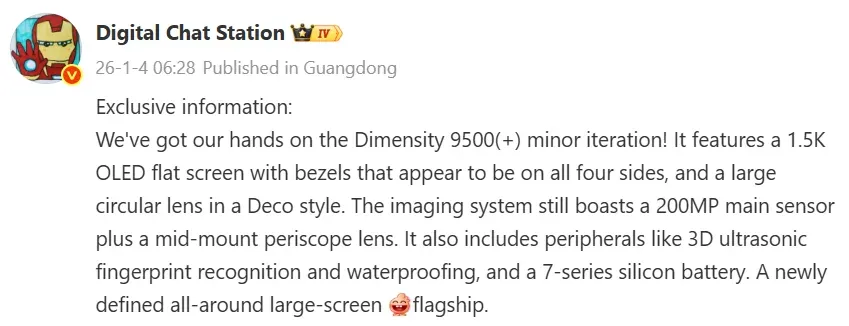 تحت الغطاء، يبدو أن فيفو ستعتمد على معالج Dimensity 9500 Plus القادم من ميديا تيك. يُقال إن هذه الشريحة هي نسخة مكسورة السرعة (Overclocked Version) من معالج Dimensity 9500 الحالي، مما يعني أداءً أسرع وأكثر كفاءة.