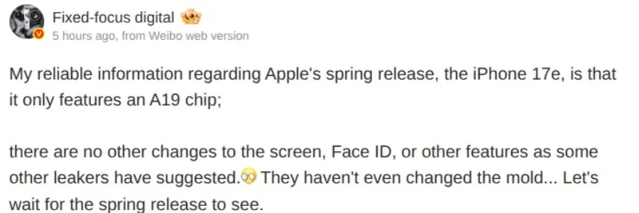 المُسرِّب الصيني Fixed Focus Digital عبر منصة ويبو (Weibo) لم يتردد في وصف iPhone 17e بأنه في جوهره “iPhone 16e مع معالج جديد”. ووفقاً له، لم تُجرِ آبل أي تحديثات ملحوظة على: