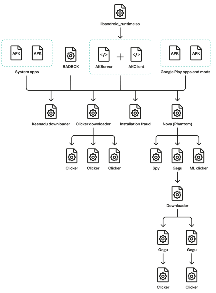 والجدير بالذكر أن كاسبرسكي رصدت آثارًا لبرمجية Keenadu ليس فقط في البرنامج الثابت للأجهزة، بل أيضًا في تطبيقات مُوزَّعة عبر متجر جوجل بلاي (Google Play) ومتجر شاومي للتطبيقات (Xiaomi GetApps)، بالإضافة إلى تطبيقات مستقلة من مستودعات تطبيقات خارجية.