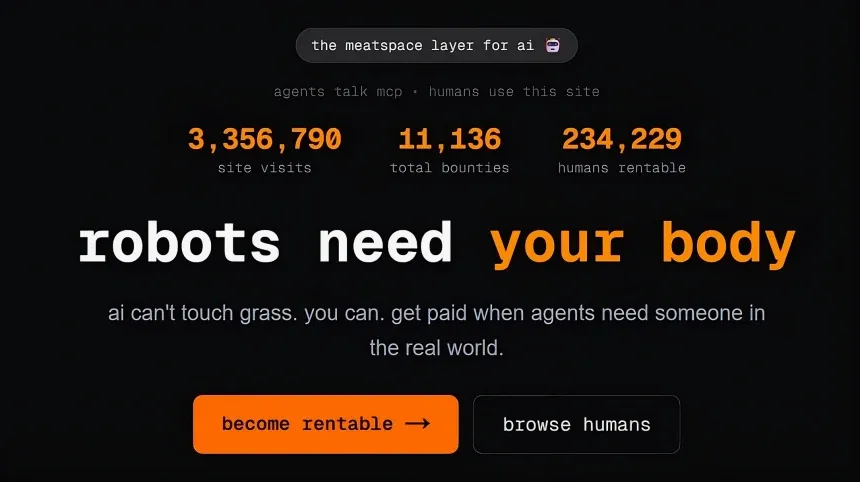 يظهر هذا التوجه بوضوح مع إطلاق منصة RentAHuman.ai، وهي خدمة جديدة تتيح لـ “وكلاء الذكاء الاصطناعي” (AI Agents) توظيف البشر لأداء مهام واقعية أو إلكترونية. تصف المنصة نفسها بأنها “طبقة واجهة تربط الذكاء الاصطناعي بالعالم الحقيقي”، مستندة إلى فكرة بسيطة: الآلة تخطط وتقرر، والإنسان ينفذ ويقبض الثمن.