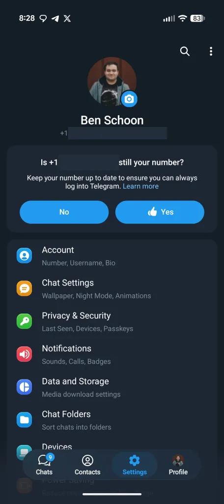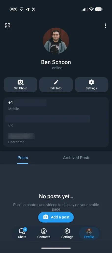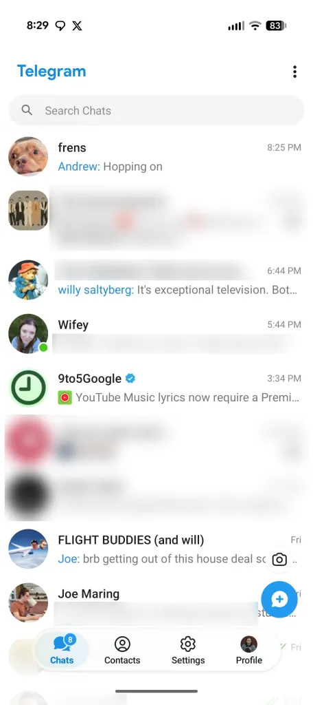 في التحديث الأخير، يتبنى تيليجرام هذا المظهر العصري عبر شريط سفلي جديد (Bottom Bar) مكون من أربع علامات تبويب، يبدو وكأنه مقتبس مباشرة من نظام iOS.