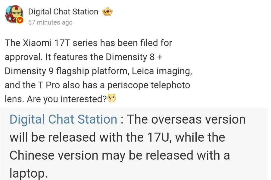 وفقاً للمُسرّب الصيني المعروف ديجيتال شات ستيشن (Digital Chat Station)، قد ينطلق هاتفا Xiaomi 17T وXiaomi 17T Pro عالمياً يوم 28 فبراير، وهو التاريخ ذاته المُحدد للكشف العالمي عن سلسلة Xiaomi 17 الرئيسية. وإذا صحّ هذا التسريب، فإن شاومي ستطرح أربعة هواتف رائدة دفعة واحدة في حدث واحد.